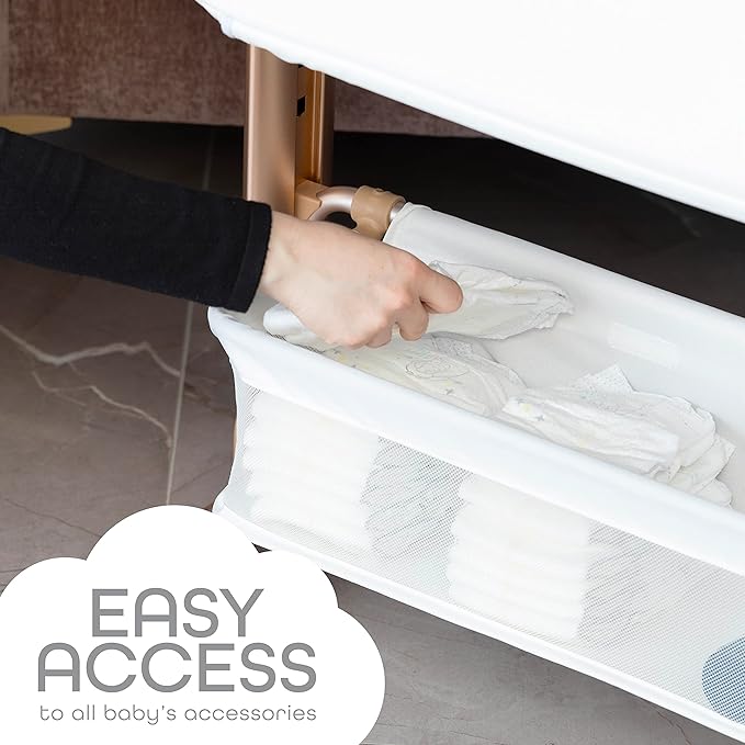 - Keep Baby Essentials Within Reach: Below, the bedside sleeper bassinet is a compact yet spacious compartment that allows you to keep burp cloths and diapers easy accessible to clean those unexpected surprises. Forget running to baby’s room every time your baby poops.