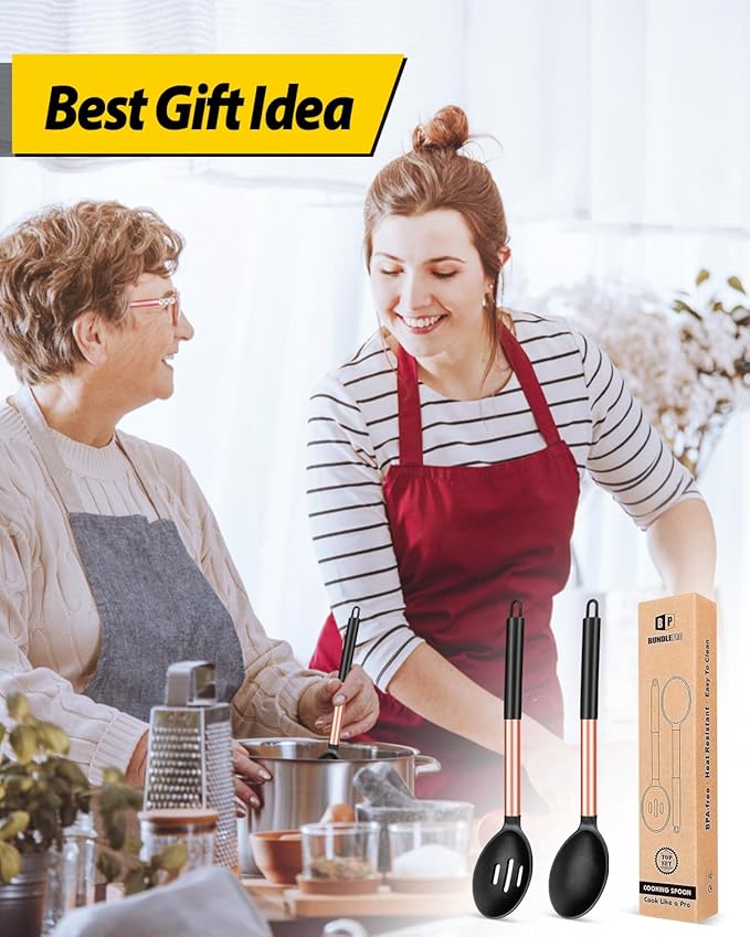 Pack of 2 Large Silicone Cooking Spoons,Non Stick Solid Basting Spoon,Heat-Resistant Kitchen Utensils for Mixing,Serving,Draining,Stirring (ROSE GOLD BLACK)