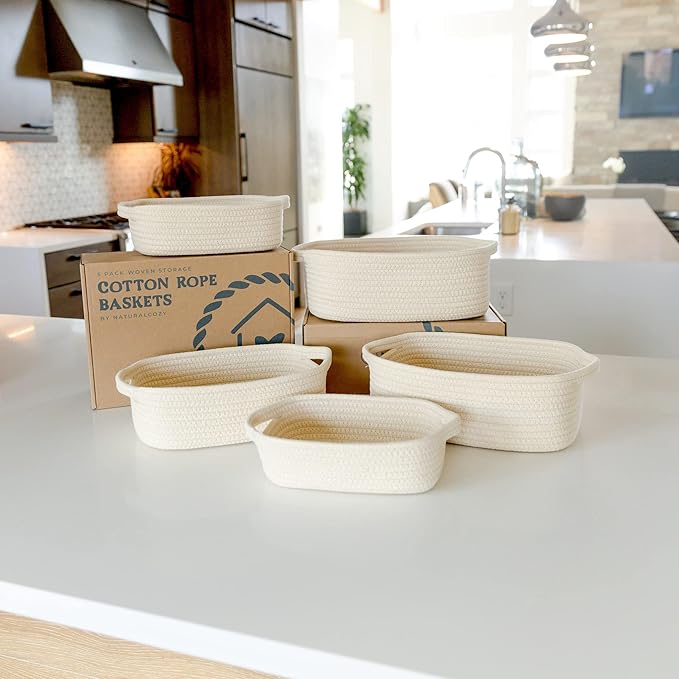 - 5 BASKETS FOR 5X THE ORGANIZING POWER: Life is messy...but your house doesn’t have to be! With 5 beautiful rope baskets for organizing, you’ll defeat messy rooms like a true supermom! Use the largest baskets for Montessori displays or countertop fruits holder, create the cutest dog toy storage or bathroom hand towel holder with the medium ones and stash jewelry or keys in the smallest. Biggest (11.8"x8.7"x4.3"), (11"x7.9"x3.9"), (10.2"x7.1"x3.5"), (9.1"x6.3"x3.1"), Smallest (7.9x5.5"x2.8")