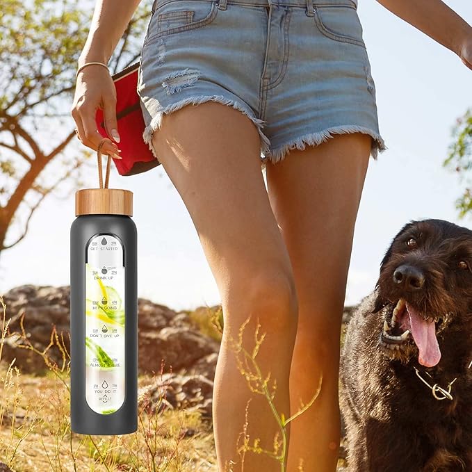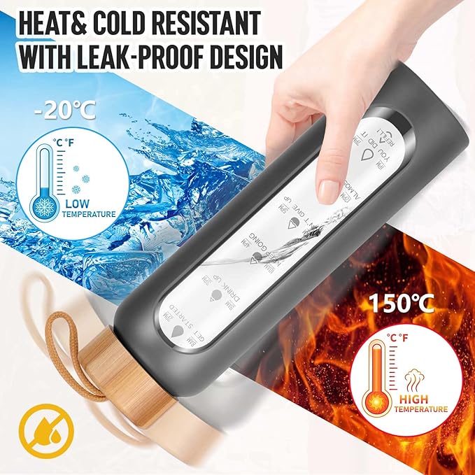 - Your Ultimate Hydration Partner: Our clear glass drinking bottle are made of borosilicate glass, which is dishwasher safe, leak proof, BPA, BPS, PVC, lead, and cadmium free. These durable and aesthetic reusable glass time water bottles will not crack under extreme temperature and pressure