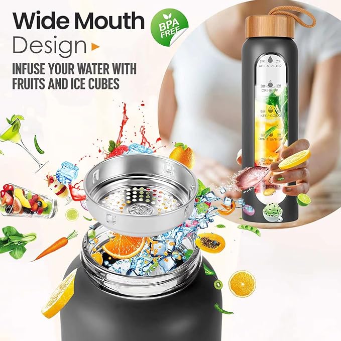 - Innovative and Convenient: The Aqulea wide mouth water bottle glass package comes with a leak-proof glass bottle with bamboo lid, a non-slip protective silicone sleeve for easy grip and maximum impact protection, an 18/8 stainless steel strainer for infusion water bottle, and a retractable brush