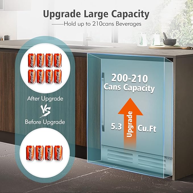 - 【210 Cans Large Capacity Wide refrigerator 】The beverage refrigerator holds up to 210 cans of drinks. You can cool your favorite beverages or wines in different sizes. Meanwhile, the beverage cooler is equipped with soft LED ambient light which helps brighten your beverage in the dark.