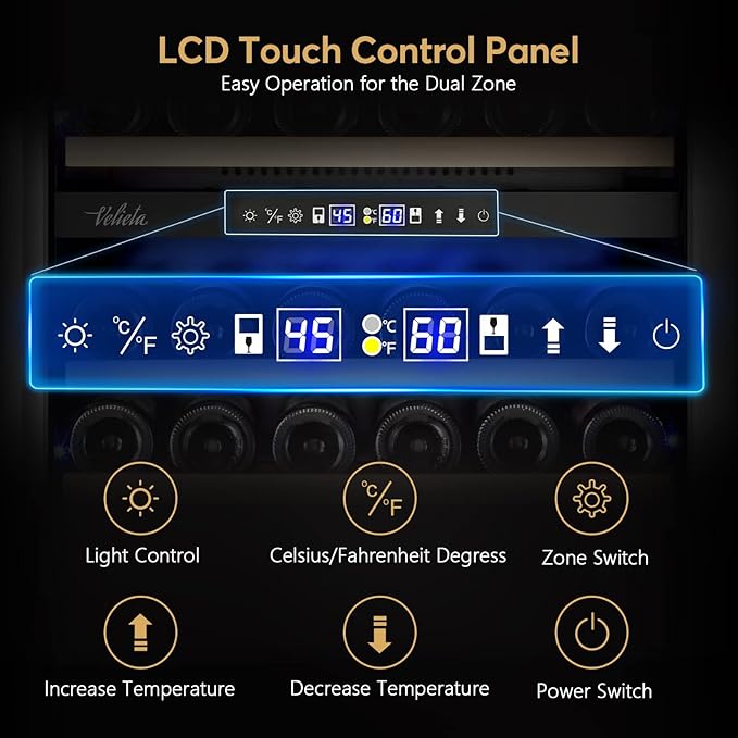 - 【Temperature Memory Function & Smart Control】 Restore the set temperature in the wine cooler after it is back on from power lost automatically Besides Velieta wine fridge has a smart LED control display that makes it easy to operate.