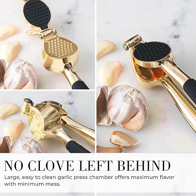 - ✔ THOUGHTFULLY DESIGNED AND ELEVATED GOLD KITCHEN TOOLS AND GADGETS — features of our unique gold and black kitchen accessories include white mini tongs for cooking with silicone tips, gold garlic press with large chamber for easy cleaning, soft grip gold can opener with large knob for ease of use, gold pizza cutter wheel with built-in finger guard, gold whisk and gold grater with loop handle for storage and gold vegetable peeler with built-in potato eye remover and wide swivel blade