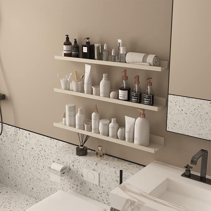 - Multi-Size Shelves Set: The 3 pack 36β long shelves varying in width and depth, large shelf 36.02 x 5.51 x 2.68 inches, medium shelf 36.02 x 4.69 x 2.32 inches, small shelf 36.02 x 3.82 x 2 inches. They provide enough space for your utility and display purposes. (PLS NOTE: It is not pure white, it is more of a beige or light grayish woodgrain white, but it is still chic )