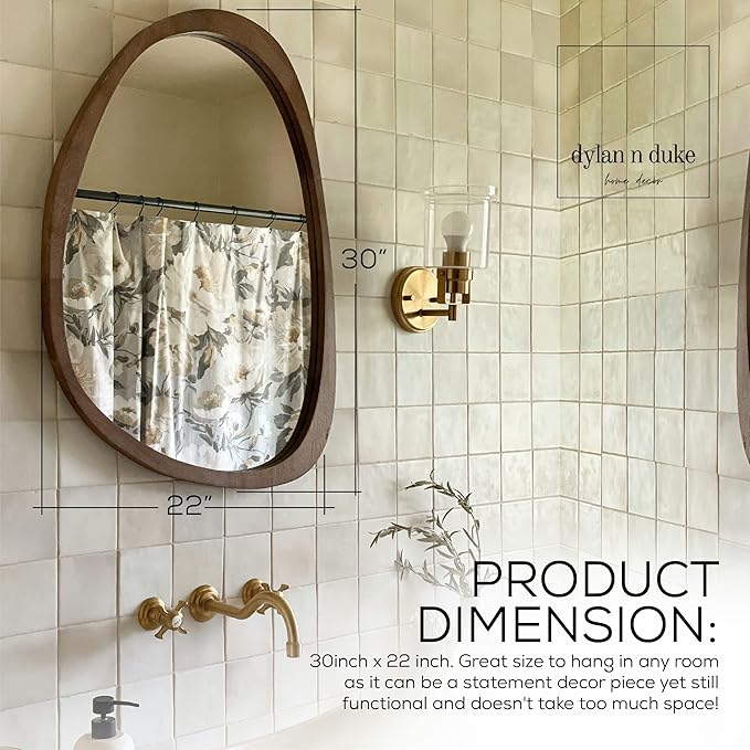 - [PERFECT SIZE FOR ANY ROOM] Mirror's diameter: 30inch x 22 inch. Great size to hang in any room as it can be a statement decor piece yet still functional and doesn't take too much space. The asymmetric mirror is easy to install. There are four hanger on the back of the mirror so you can hang it on the wall securely and easily. Hanging kit is included as well.