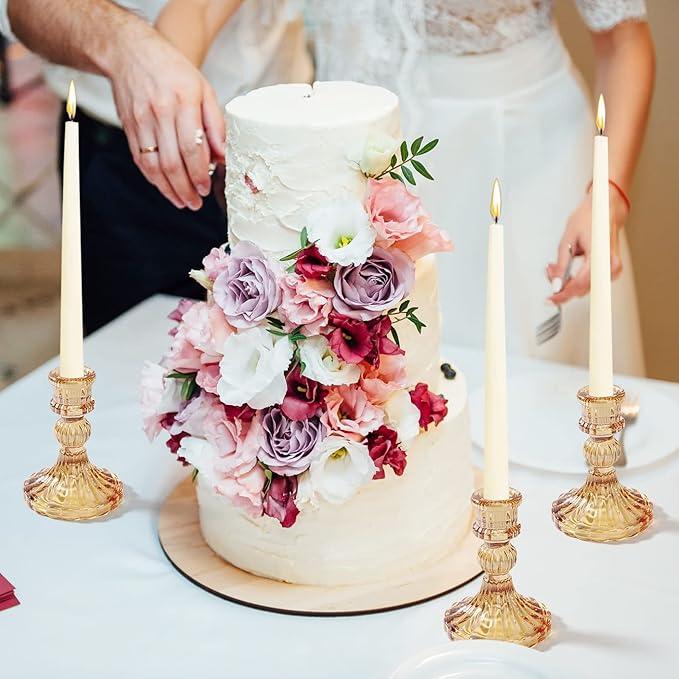 - ❤️Candlestick Holders Set ❤️-- Universal Taper Size: Top inner diameter 0.78'', bottom diameter is 3.15''x 4''H. They fit most standard taper candles, chime candles and flameless LED candles. [NOTE]You wanna candles stands straight? Melt the bottoms of the candlesticks into the holder and hold it in place for 10sec!