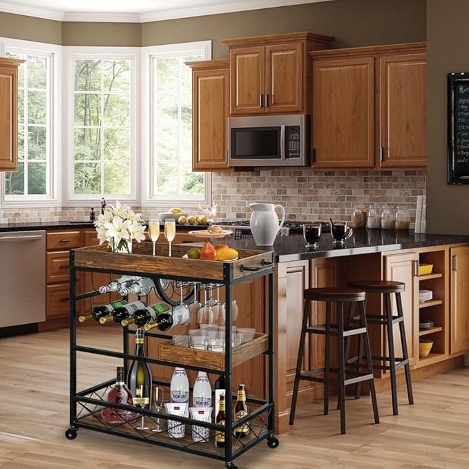 - 【Multiple Occasion】This mobile rolling bar serving cart meets multi-purpose needs: as serving cart during dinner or party time; as portable mini home bar for leisure time; as food or drink station during tea time or outdoor BBQ