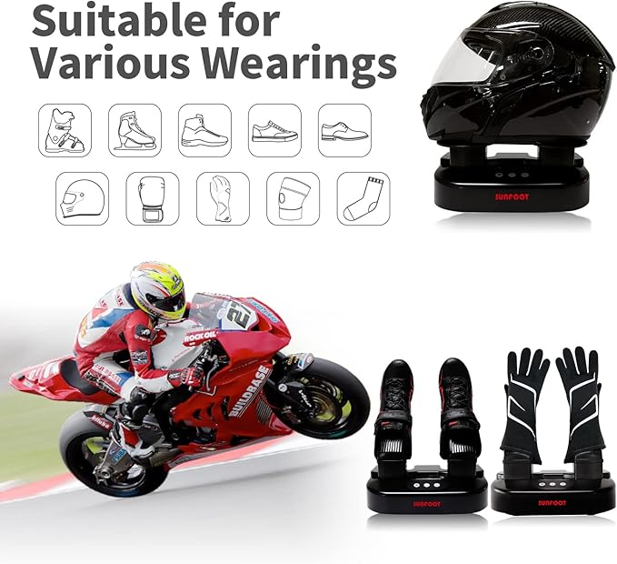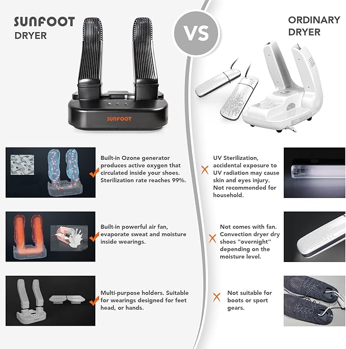 - SAFE AND STRICTLY CERTIFIED WITH SHARP STANDARDS: 8 safety protection, inspect each unit before packing. Sunfoot Shoes Dryer is traded more than 20 countries and has got great reputation among sports fans. SUNFOOT is dedicated to enhancing your feet health and overall well-being by recovering you a pair of dry and clean shoes.