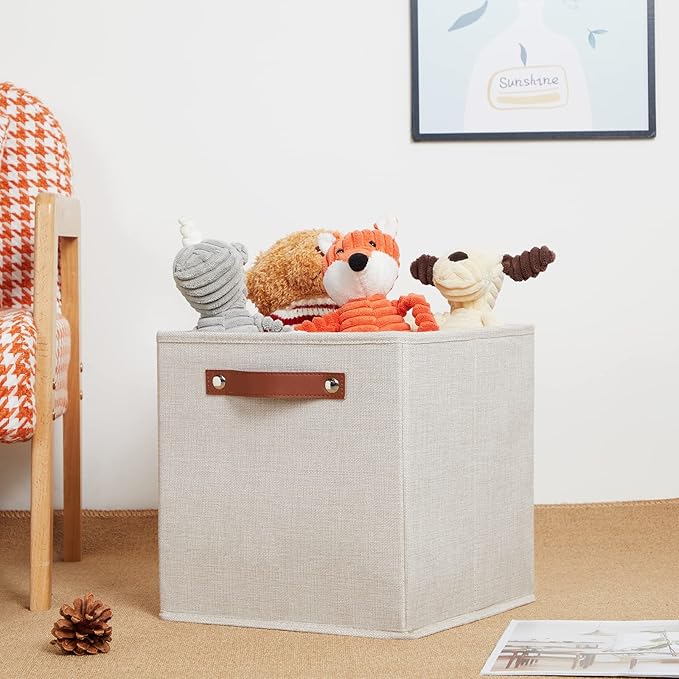 - 【Premium Material】The fabric used in the 11 inch fabric storage cubes bins baskets for shelves is fashionable and breathable, sturdy, breathable fabric materials with no peculiar smell, and the cardboard inside is strong and easy to fold. These cloth storage bins for cube organizer are sturdy enough to hold your stuff well. The leather handle is durable and easy to carry