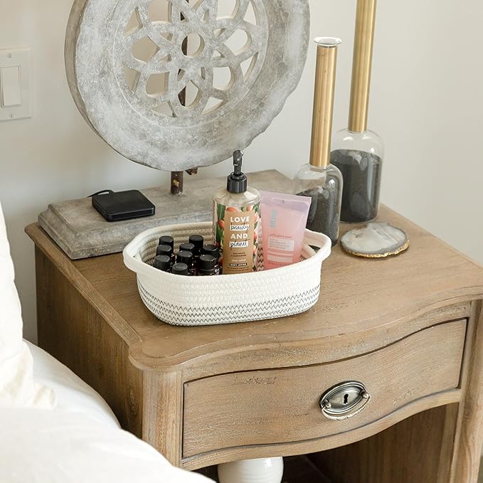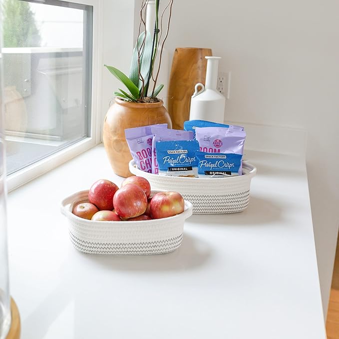 - 5 BASKETS FOR 5X THE ORGANIZING POWER: Life is messy...but your house doesn’t have to be! With 5 beautiful rope baskets for organizing, you’ll defeat messy rooms like a true supermom! Use the largest baskets for Montessori displays or countertop fruits holder, create the cutest dog toy storage or bathroom hand towel holder with the medium ones and stash jewelry or keys in the smallest. Biggest (11.8"x8.7"x4.3"), (11"x7.9"x3.9"), (10.2"x7.1"x3.5"), (9.1"x6.3"x3.1"), Smallest (7.9x5.5"x2.8")