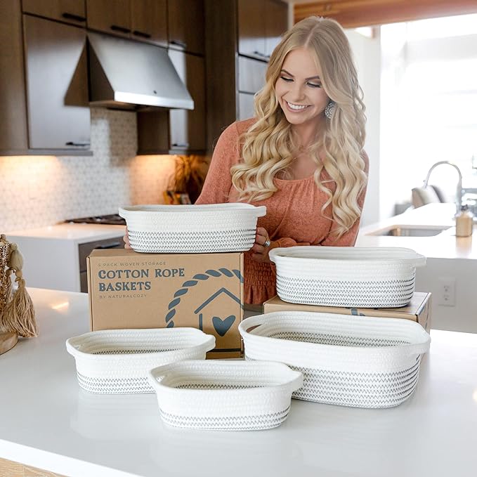NaturalCozy 5-Piece Rectangle Storage Basket Set- Natural Cotton Rope Woven Baskets for Organizing! Small Basket for Montessori, Baby Nursery, Dog Toy Baskets, Cat Toy Box, Bathroom Organization Bin