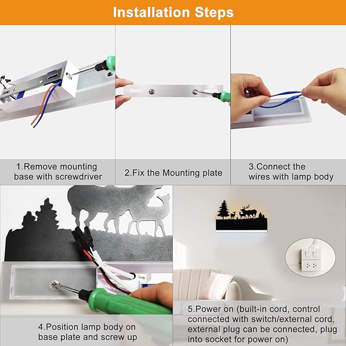- 【Easy to install】 No professional experience required to install wall lighting, just follow the simple installation instructions for perfect installation, There is no need to distinguish between the two wires, any one of the wires is connected to the live wire of the home circuit, and the other is connected to the neutral wire. but for safety, please install under the guidance of professionals.