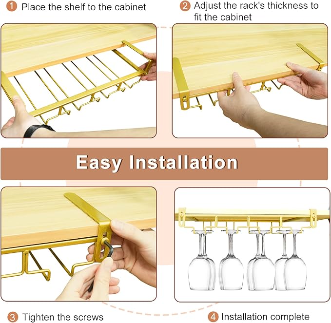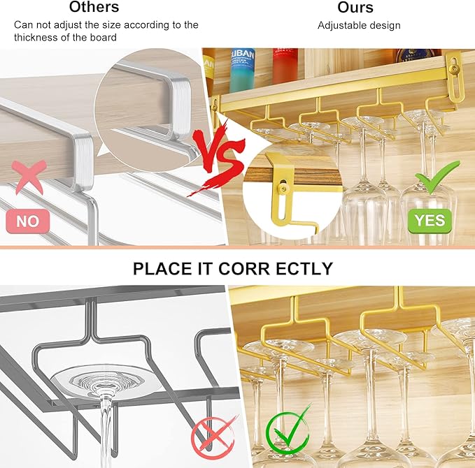 - 【Adiustable Wine Glass Rack】You can adjust the rack's mezzanine width to fit your cupboard, fit for 0.2-1.6in thickness(0.5-4CM). The perforation-free installation design makes the wine glass holder not only suitable for wooden partitions, but also for floating plates of different materials such as stone plates and glass partitions.