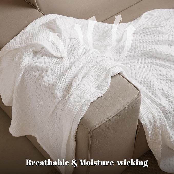 PHF 100% Cotton Waffle Weave Throw Blanket, Soft Lightweight Breathable Cozy Summer Throws for Couch Bed Sofa, Luxury Aesthetic Woven Blanket for Home Decor & Office, 50"x60", White