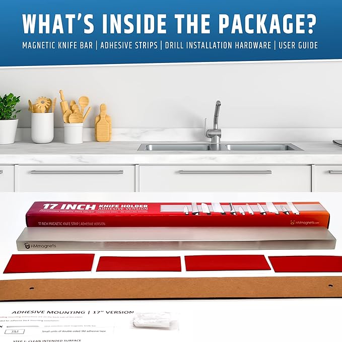 - SAFER INSTALLATION: Our 17” no-drill magnetic knife bar is an all-in-one unit, reducing the risk of fingers getting caught or pinched. The HMmagnets knife bar will not fall off your wall, ensuring safety and peace of mind. Only works on flat walls/tiles.