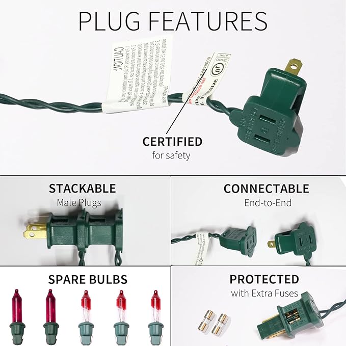- Product Nature:Each mini Christmas light set comes with end-to-end plug, can be connectable up to 3sets (450 lights). Each bulb space 2.5in, 2.5V and 0.425W per bulbs, built-in 3A fuse for safe use. Extra bulbs and fuses are included.