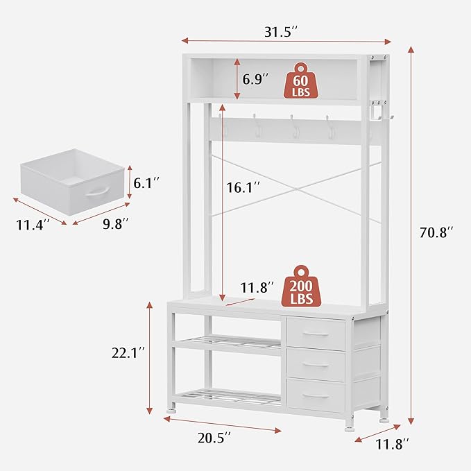 - Upgrade 6-in-1: The Entryway Shoe Bench Coat Stand combines to 12 hooks(7 hook accessories), 3 drawers, a storage shelf, a clothing rail, a shoe rack and a shoe bench holding 200lb to keep your entryway organized and functional. Moreover, our coat rack with shoe storage creates a concise and casual style.