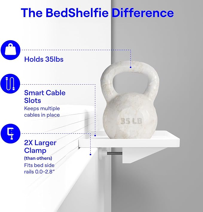 - EFFORTLESS DESIGN, ENDLESS VERSATILITY The BedShelfie caddy tray is all about simplicity and convenience—no complicated setup required. Whether you're using it as a headboard shelf, sofa tray, changing table, or cord organizer, it adapts to your lifestyle with ease. Loved by city dwellers and students alike, it's a dorm room essential, teen nightstand, or kid-friendly side table. With a sturdy 35lb weight capacity, it securely holds everything from your 13-inch MacBook to your phone and water bottle. Perfect as a floating nightstand or compact shelf for bunk beds, loft beds, and college dorms—complete with a built-in cup holder that slides right into bed life.