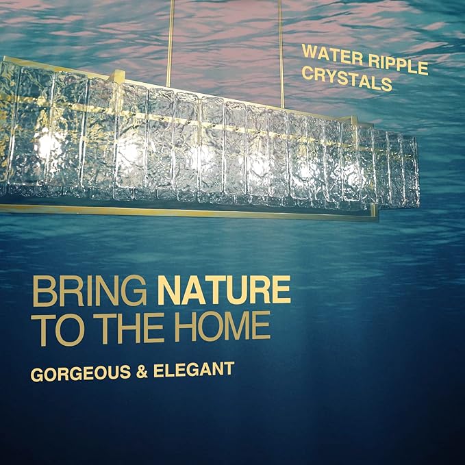- [BRING NATURE HOME ]: This gorgeous Chandelier with 100% handcrafted water ripple glass. The Nature-inspired accessories can Strengthen the calming power of your home. Each glass is unique, mimicking the calming, restorative ambiance of the outdoors. Gold matt coating metal frame is very friendly to a variety of scenarios.