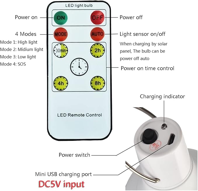 - Two Way Charge: The light bulb can be charged by the solar panel or DC 5V adaptor by USB cable, it can keep lighting for 4-6 hours after fully charged.LED lifespan is 50000H. When charging by solar panel: please put the solar panel outside under the sun and keep the solar panel facing the sunshine directly.At the same time connect the bulb with cord to the bulb for 5-8 hours, charging indicator is red when charging, full charged still red.(5-8V power adaptor for charging as well) .