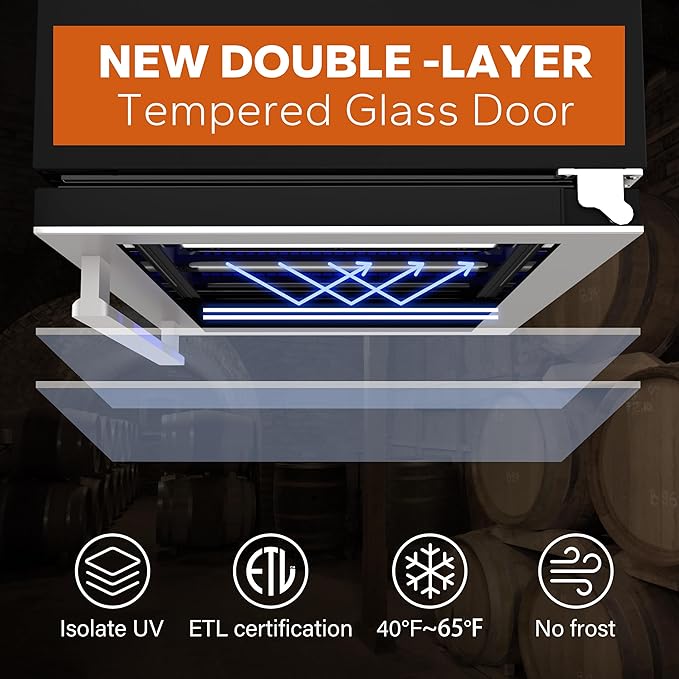 - 【Reversible double-glazed stainless steel door】We use double glass door with UV protection and high sealing to keep the flavor of red wine and prevent it from oxidizing. Good sealing to keep the temperature inside the refrigerator. Soft and warm light, restore the real wine cellar light environment. Brushed stainless steel door frame, effective anti-fingerprint and anti-rust. We designed hidden door hinges, so you can freely choose the door orientation according to your needs.