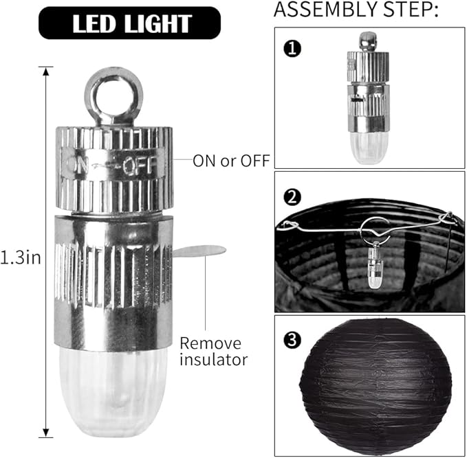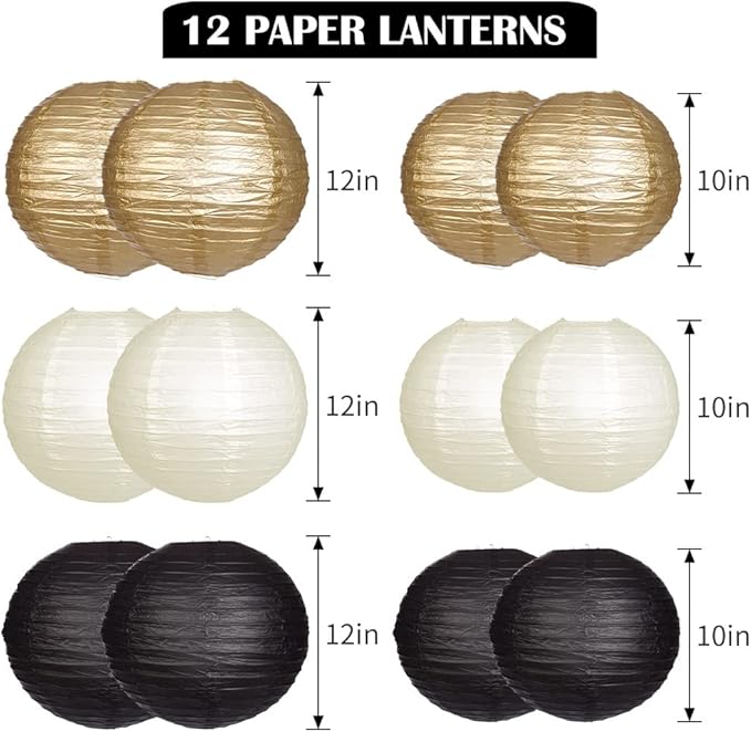 - PAPER LANTERN SET INCLUDED- Black and gold party decorations set including 6 pieces of 10 inch paper lanterns, 6 pieces of 12 inch paper lanterns, 12 pieces of battery operated mini LED lights, set comes in black, gold and ivory colors