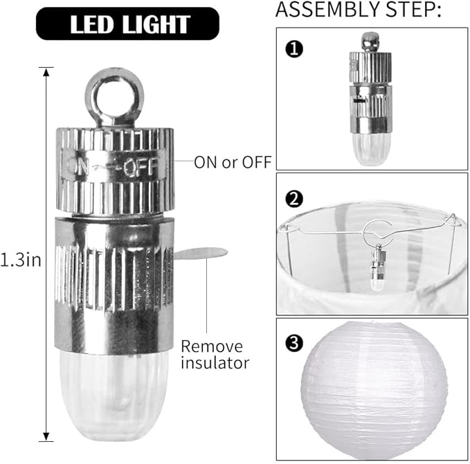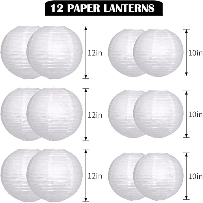 - PAPER LANTERN SET INCLUDED- White party decorations set including 6 pieces of 10 inch paper lanterns, 6 pieces of 12 inch paper lanterns, 12 pieces of battery operated mini LED lights, set comes in white colors