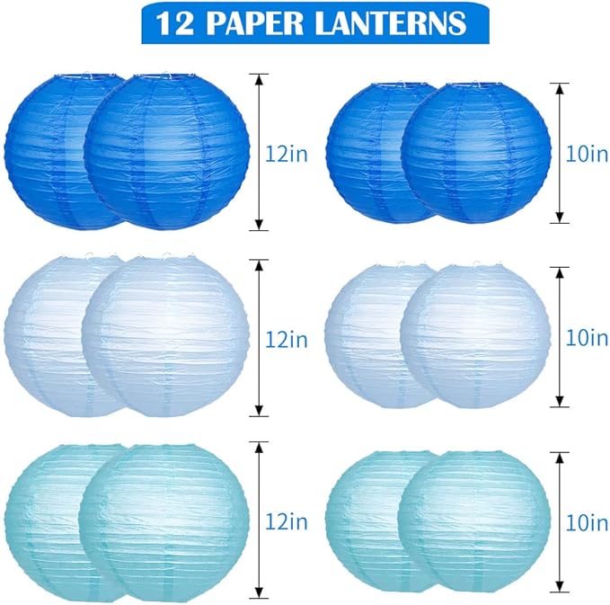 - PAPER LANTERN SET INCLUDED- Blue party decorations set including 6 pieces of 10 inch paper lanterns, 6 pieces of 12 inch paper lanterns, 12 pieces of battery operated mini LED lights, set comes in pink and light blue colors