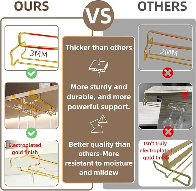 - Affordable Gift For Wine Lovers:this glasses storage holder rack provides a decent holding point and is very stylish.The sturdy materials ensure good strength and longevity. Get more than 2 PCS now for you or your friends who love drinking.Please Measure The Thickness Of The Board Of The Shelf Or Cabinet Before Purchase