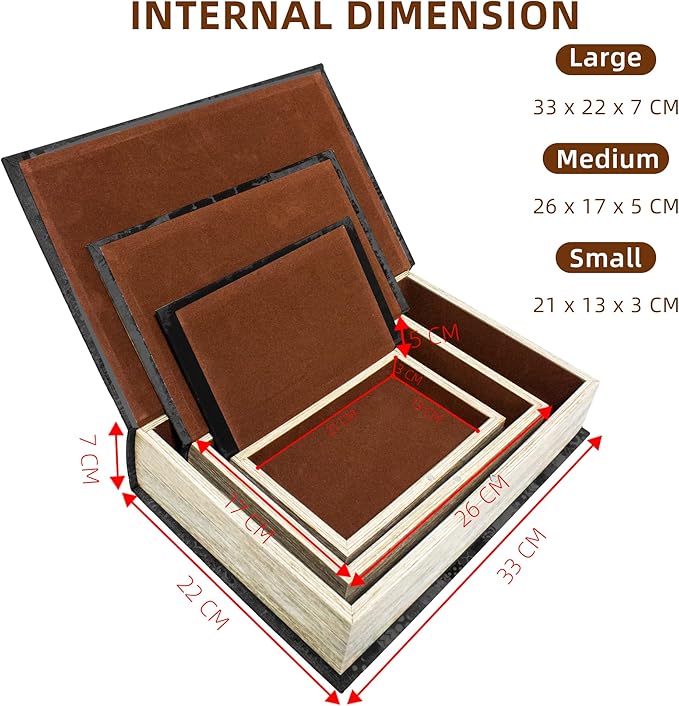 - This set of fake book boxes consists of three large, medium and small boxes. Large Book Box: External Size: 13" Ă— 8.5" Ă— 2.75"/ Internal Size: 11.7" Ă— 7.5" Ă— 2.3" Middle Book Box: External Size: 10.2" Ă— 6.5" Ă— 1.9"/ Internal Size: 8.8" Ă— 5.5" Ă— 1.5" Small book box: Outer size: 8.2" Ă— 5" Ă— 1.1"/ Inner size: 7" Ă— 3.9" Ă— 0.8"