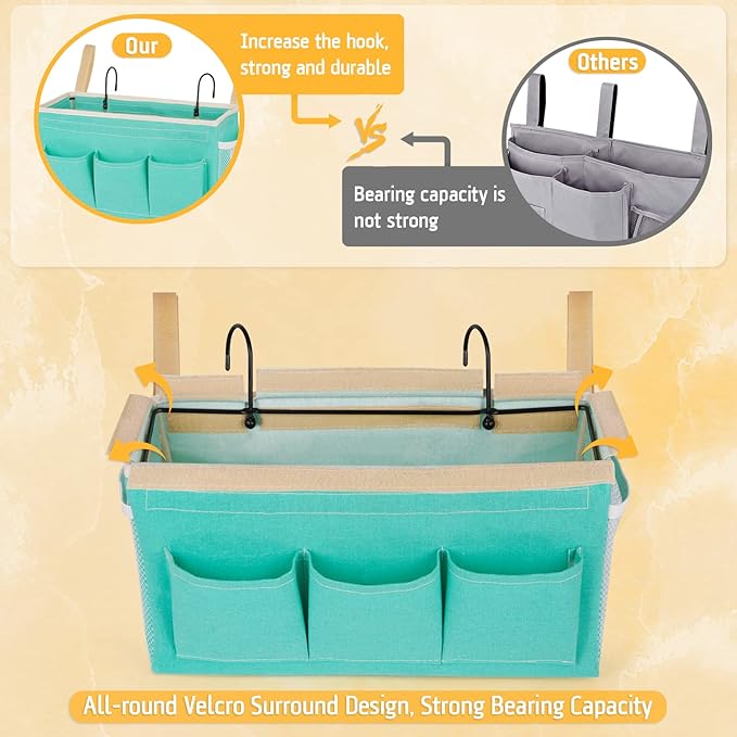 - 【Strong Bearing Capacity】In addition to the metal hook, the bedside caddy also added adjustable straps on both sides to help the bedside organizer to be additionally fixed in place, enduring enough to bear heavy weight and prevent sagging.
