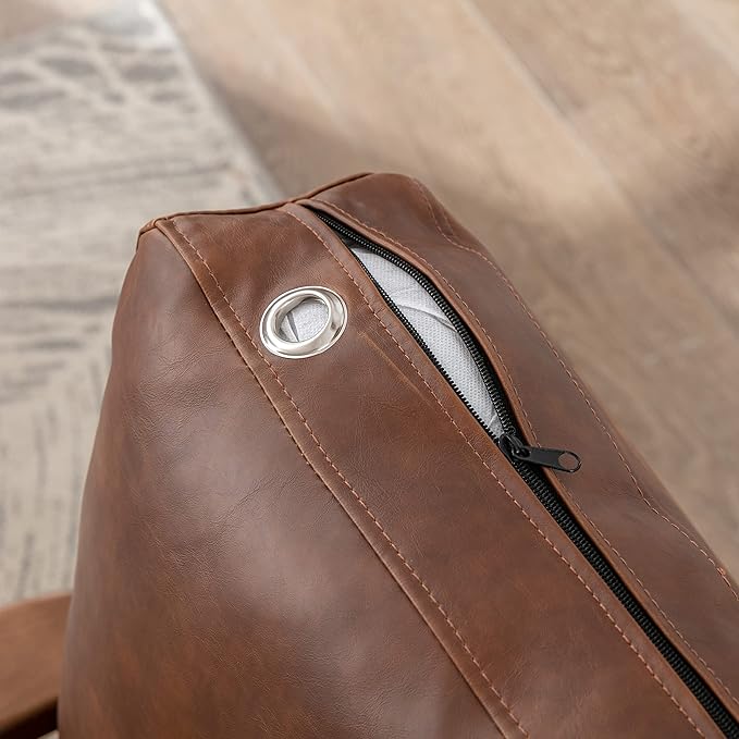 - Mid-century lounge chair, two super soft cushions are upholstered in brown PU leather which adds a retro touch to this accent chair. Both backrest and seat cushions are REMOVABLE