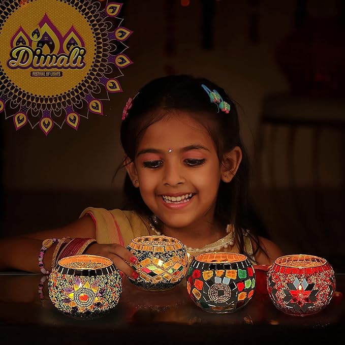 SHMILMH Glass Candle Holder Set of 4, Diwali Gift Votive Candle Holders Handmade Mosaic Glass Tealight Holders Diwali Christmas Table Decorations for Home