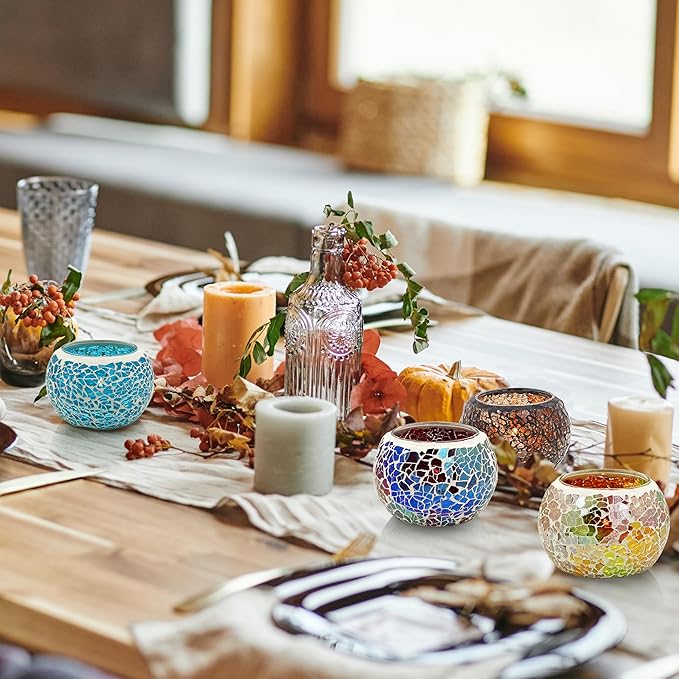 - Mosaic Candle Holder: Includes 4pcs cracked glass candle holders in 4 colors: amber, yellow, red, and blue. 100% handmade with traditional crafting techniques, creates a delicate and natural ice crack texture candle holders