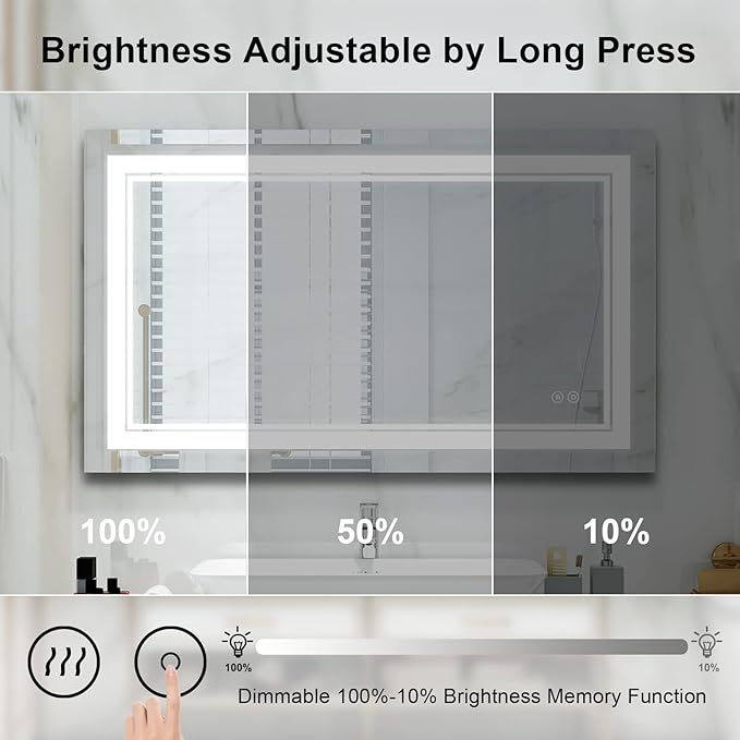 - Dimmable: Our smart vanity mirrors can adjust the color (warm, natural and white) and brightness (100%-10%) of the lights. Not only that, the lighted bathroom mirror also has a memory function. The next time you turn it on, it will keep the light color and brightness that suits you best. Perfect for hotels, high-end salons or bedrooms and bathrooms at home.