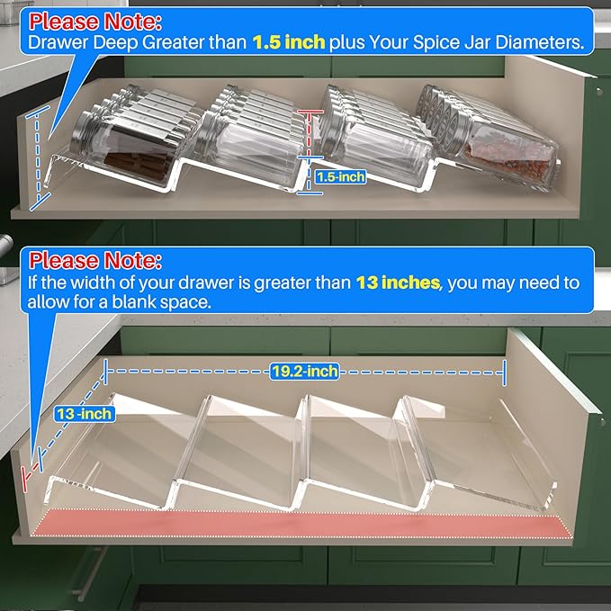 - Please note: Before purchasing, ensure that your drawer's depth is greater than 4 inches.【Large Capacity up to 28 Spice Jars】The Spice Rack Tray for Drawer adopt tiered design provides plenty of storage space, 4 Tiers (4 Pieces ), Each Pices 13"L x 4.5" W . 13" x 19" holds up to 28 standard 4 oz spice jars