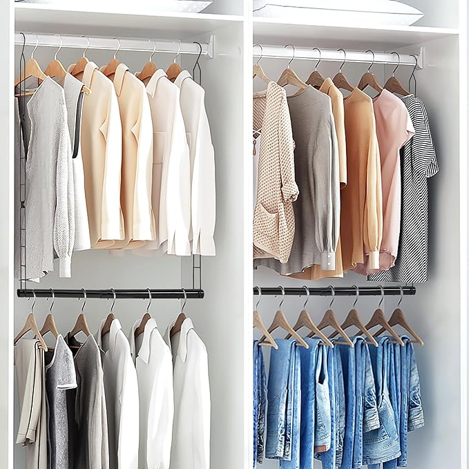 - 【Saving More Closet Space】The adjustable hanging closet rod is suitable for all wardrobes with horizontal bars and can also be used as a kids closet organizer, help your child gain more independence by easily reaching their clothes and choosing what to wear.