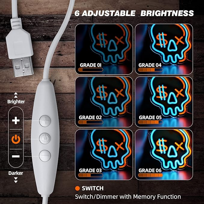 - đź’€ 6 Dimmable Switch: Our skeleton neon sign has 6 adjustable light modes, making it a great wall decoration that can replace boring desk lamps and add some color to a boy's playroom. It's perfect as a birthday or Christmas gift for your family, significant other, boyfriend, kids, and more.