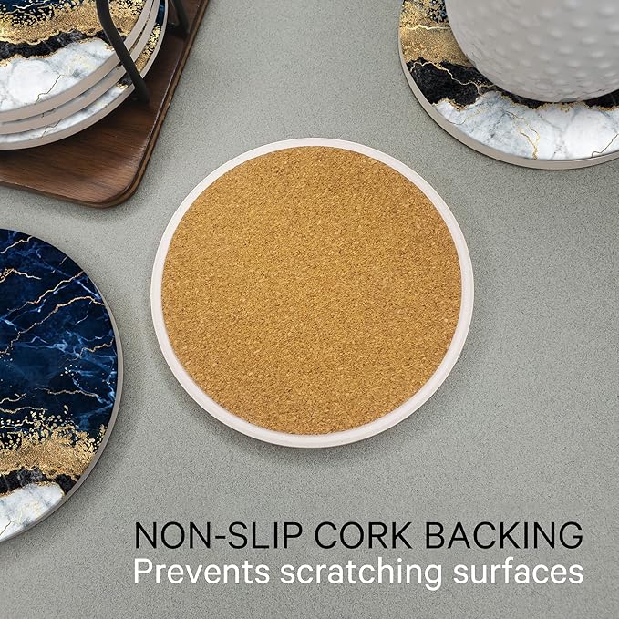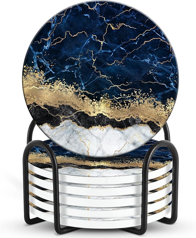 Emerson Coasters for Drinks Absorbent Set of 6 with Holder – Marble Style Coasters – Coasters for Drinks – Drink Coasters for Coffee Table – 100% Ceramic Stone Non Slip – Heavy Duty (Ripple)