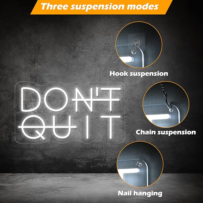 - Style & Material: The sign of Don't Quit (it also means to DO IT, don't give up)neon light is an exquisite artistic neon light decor sign. The LED neon light's combination of white is novel. The Neon Signs are made of Acrylic LED, Silicon Strips, and ABS Material, with No risk of glass breakage or leakage of hazardous materials
