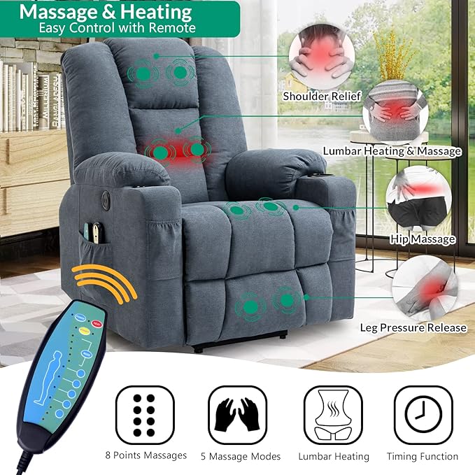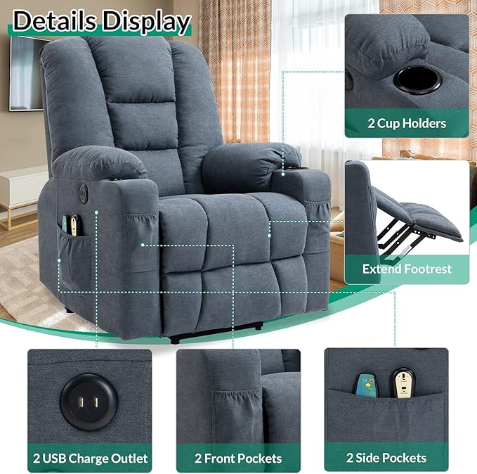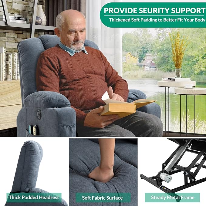 VIVIJASON Power Lift Chair Electric Recliner for Elderly Heated Vibration Massage Soft Fabric Recliner Chair with 2 Remote Controls, USB Ports, Side Pockets & Cup Holders for Living Room (Blue)