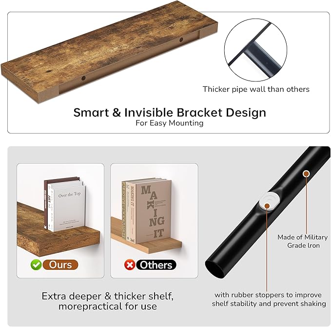 - Easy To Assemble - This floating shelves come with stainless-steel galvanized invisible brackets, toggle bolts for drywall & a simple instruction manual to help you install. The assembly of this wall shelf is very simple, only two boards and some necessary screws and other hardware, and we also have detailed instructions for you to view, you can assemble quickly. Please contact our product support team when you have any questions.