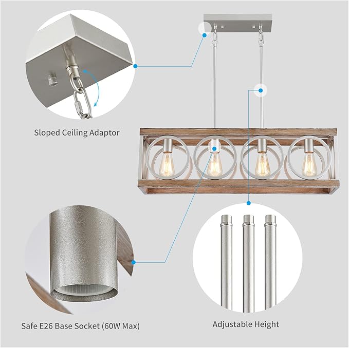 - LIGHT SOURCE: 4 x E26 (Max 60W, Not Included), suitable for LED, CFL, halogen or incandescent bulb and and work with a compatible dimmer switch (Not Included), casting a soft glamour for your dining rooms or kitchen island when the rustic chandelier lighting is on. Bulb base is UL safety standard.