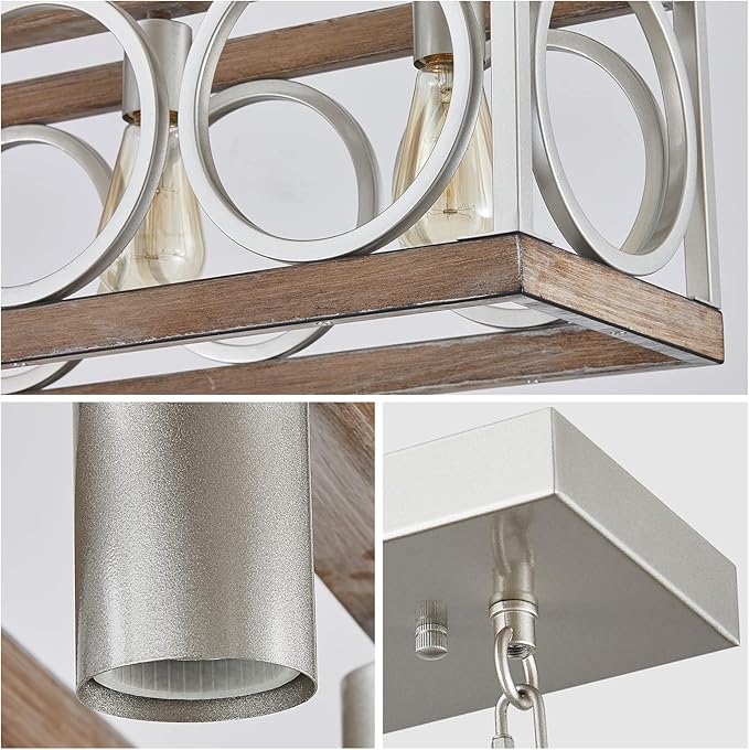 - VINTAGE FARMHOUSE CHANDELIER: The open-cage farmhouse dining room light fixture features a rectangle frame in distressed wood grain finish metal with barn-inspired cricular design stretching across each side, recalling reminiscent of classic, costal and vintage aesthetics. Please note that because the product is painted by hand, Each chandelier is unique in appearance and the uniformity of appearance cannot be strictly consistent.