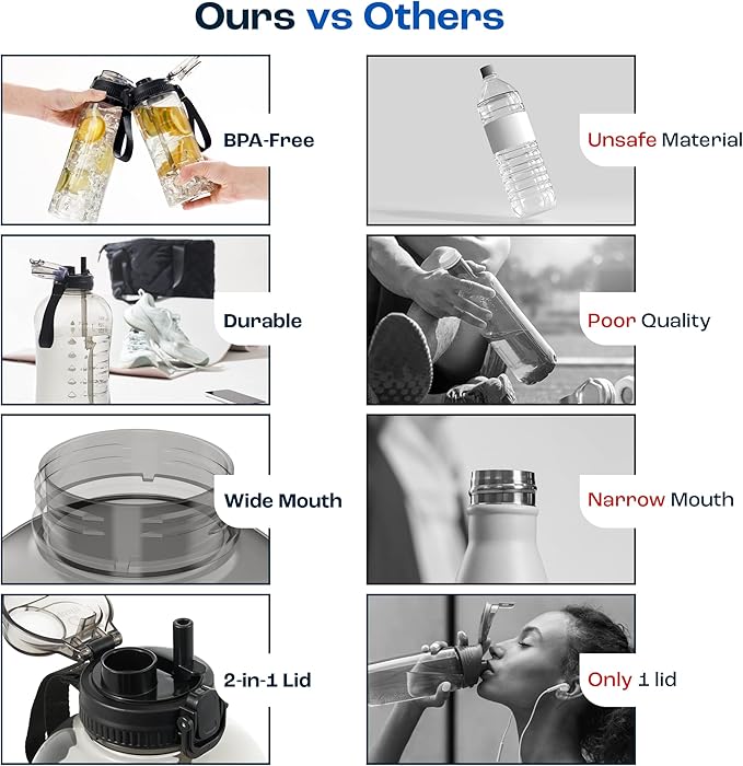 - Half Gallon Water Bottle: This 64oz water bottle with straw has a leakproof 2-in-1 lid to prevent leaks.