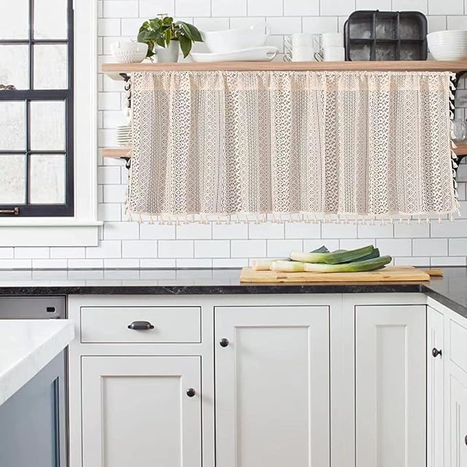 Sutuo Home Boho Sheer Curtain Valance Tier Crochet Lace with Bohemian Hollow Knitted Handmade Tassels, Short Farmhouse Window Treatment for Kitchen Cafe, Rod Pocket, 1 Panel 59" W x 24" L, Beige