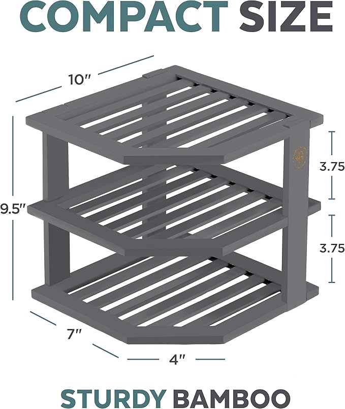 - MODERN ORGANIZATION: Upgrade your storage with this stylish gray-toned bamboo corner shelf that blends seamlessly with any kitchen, bathroom, or pantry décor