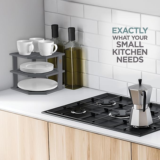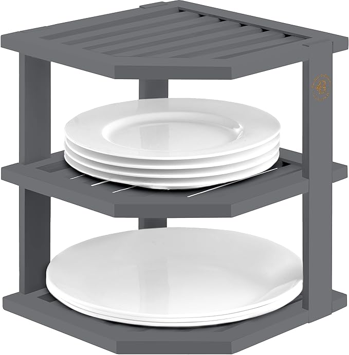 Cabinet Organizer Shelf - Bamboo Corner Rack for Kitchen Counter, Cabinet Space Saver for Plates, Dishes, Bowls, Bread Pantry, Bathroom Storage or Countertop Stand, Grey