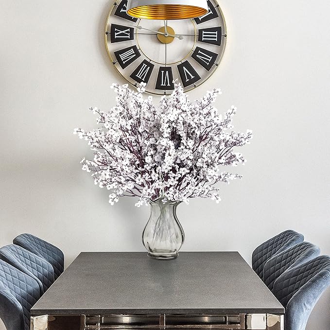 - PACKAGE & SIZE: The package has 15 white babys breath (no vase included) packed in a box, adequate enough to match many holiday ornaments and satisfy your diverse. The real touch fake silk flowers have a total length of 19in. Each piece has 5 item parts, allows you to decorate your space easily.